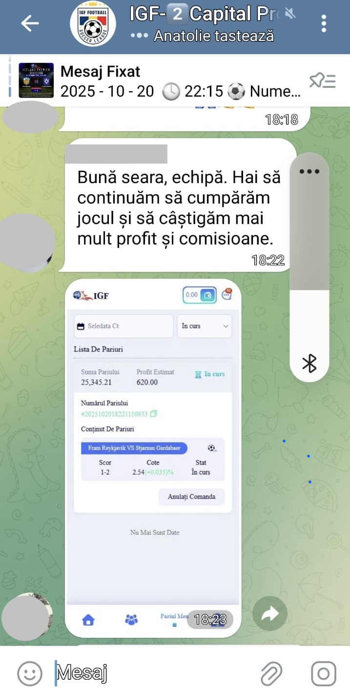 La începutul lunii noiembrie 2025, un bărbat de 37 de ani, din Râmnicu Vâlcea, a depus o plângere penală la Inspectoratul de Poliție Județean (IPJ) Vâlcea, iar ulterior ne-a povestit cum a ajuns într-un grup de pe Telegram, unde i s-au promis câștiguri rapide din pariuri sportive. Grupul purta numele IGF, entitate care – potrivit persoanelor păgubite – ar fi avut chiar și un sediu deschis pe strada Banu Mărăcine din Râmnicu Vâlcea.