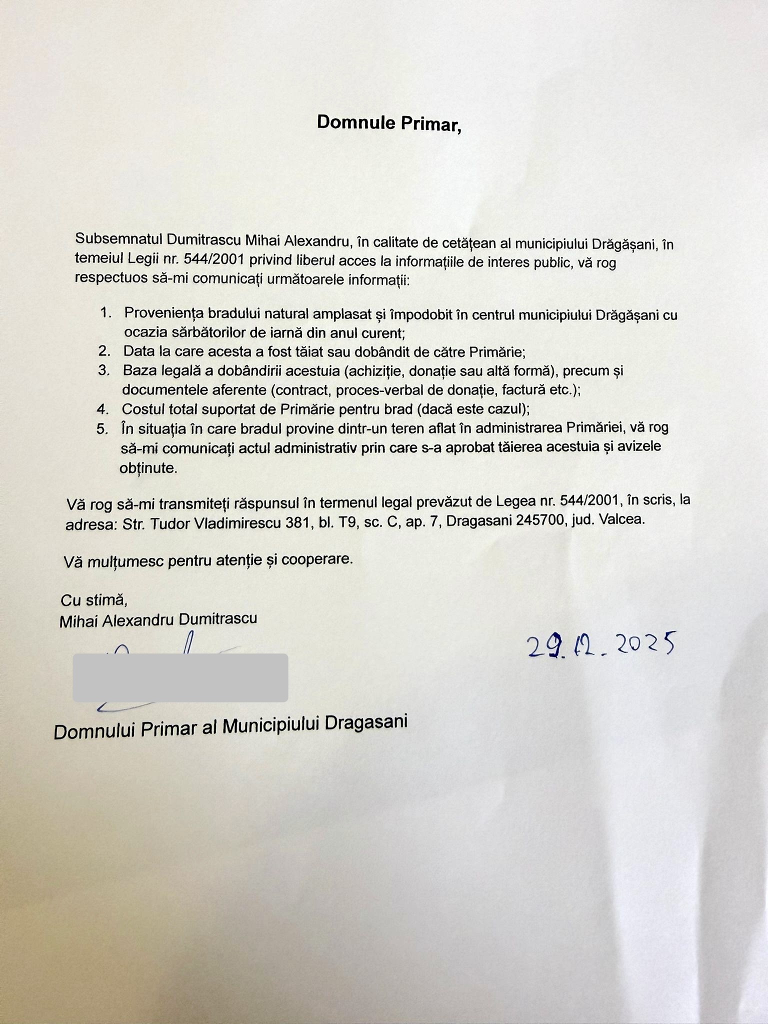 „Subsemnatul Dumitrascu Mihai Alexandru, în calitate de cetățean al municipiului Drăgăşani, în temeiul Legii nr. 544/2001 privind liberul acces la informațiile de interes public, vă rog respectuos să-mi comunicați următoarele informații: