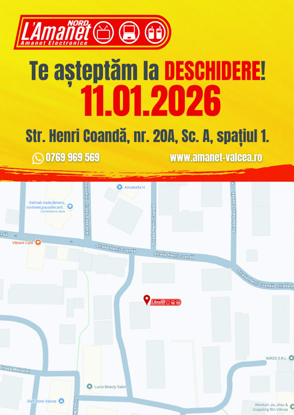 În zona de Nord a municipiului Râmnicu Vâlcea va fi deschis, începând cu 11 ianuarie 2026, un nou punct de lucru al rețelei L’Amanet. Este vorba despre L’Amanet Nord, un amanet specializat exclusiv în electronice, situat pe Strada Henri Coandă nr. 20A, Scara A, Spațiul 1.