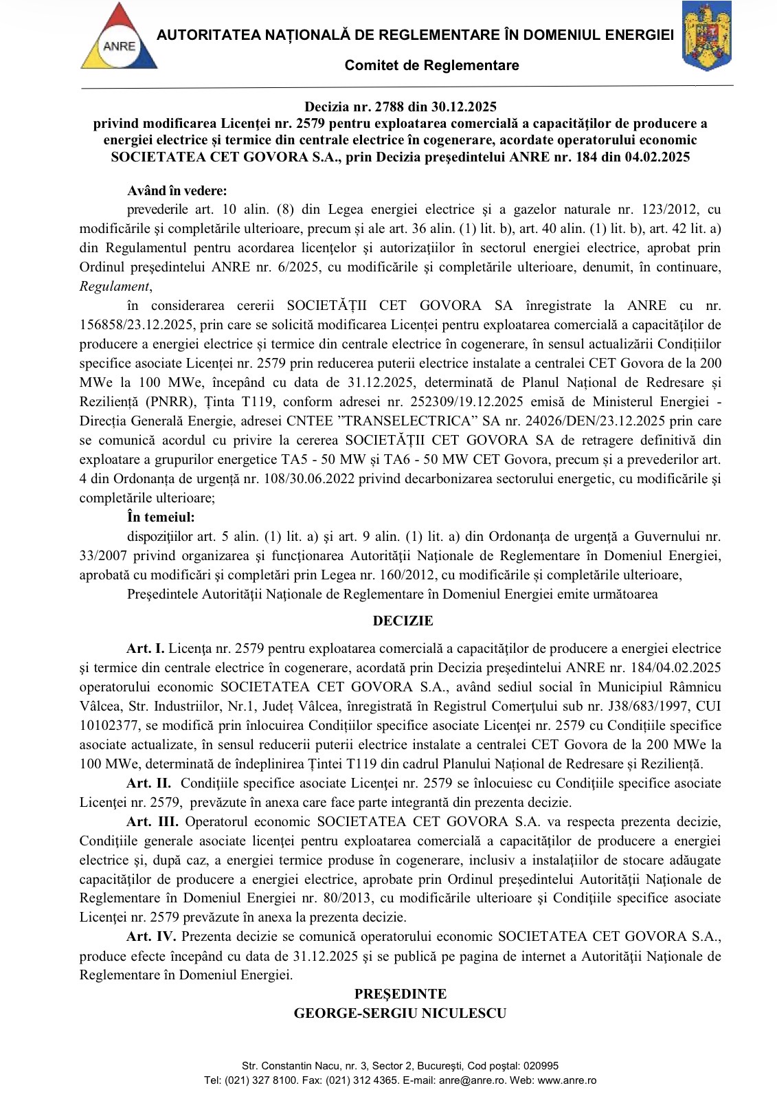 „Art. I. Licența nr. 2579 pentru exploatarea comercială a capacităților de producere a energiei electrice şi termice din centrale electrice în cogenerare, acordată prin Decizia preşedintelui ANRE nr. 184/04.02.2025 operatorului economic SOCIETATEA CET GOVORA S.A., având sediul social în Municipiul Râmnicu Vâlcea, Str. Industriilor, Nr.1, Județ Vâlcea, înregistrată în Registrul Comerțului sub nr. J38/683/1997, CUI 10102377, se modifică prin înlocuirea Condițiilor specifice asociate Licenței nr. 2579 cu Condițiile specifice asociate actualizate, în sensul reducerii puterii electrice instalate a centralei CET Govora de la 200 MWe la 100 MWe, determinată de îndeplinirea Tintei T119 din cadrul Planului Național de Redresare şi Reziliență” – se arată în documentul ANRE.