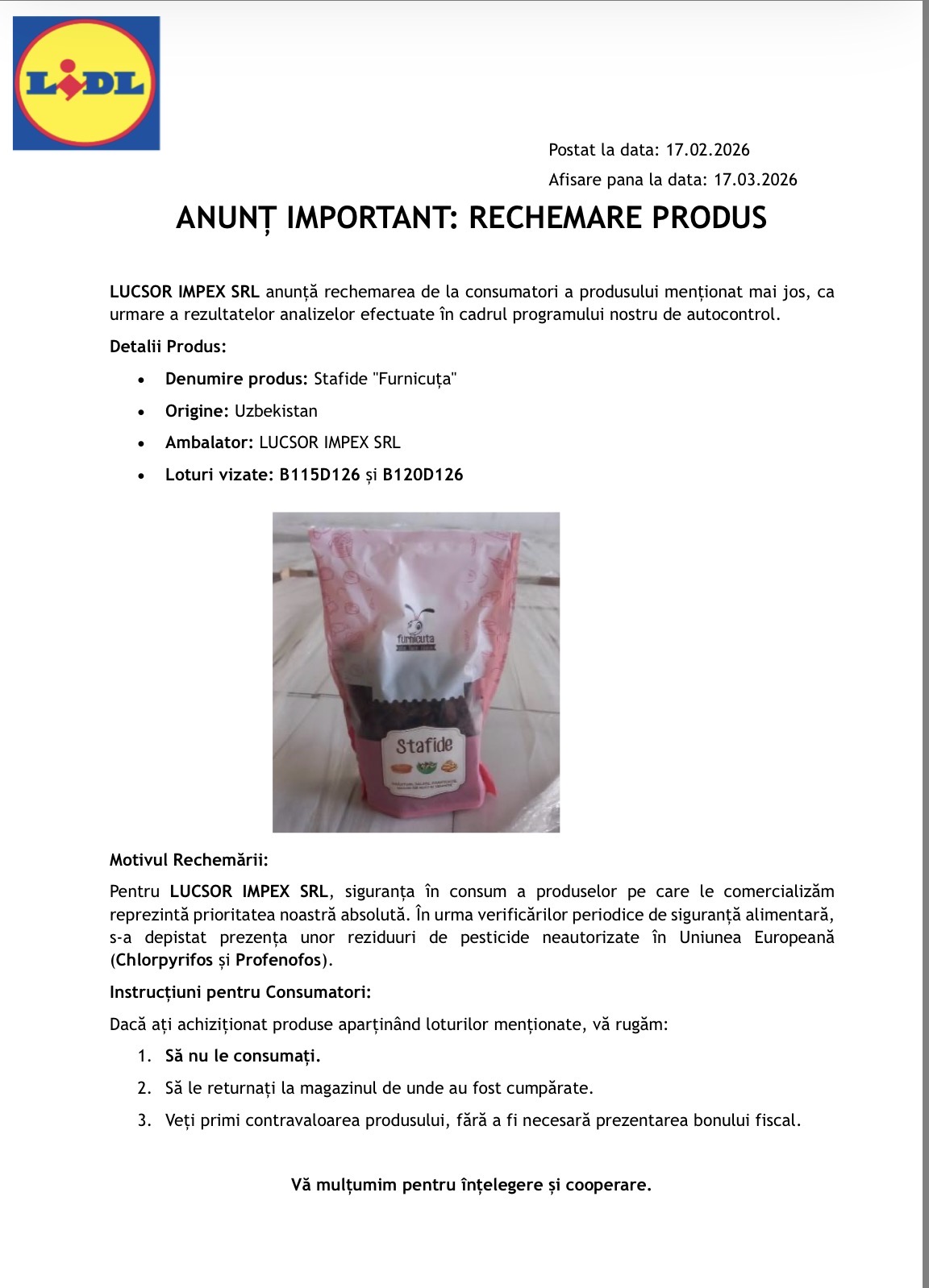 „Pentru LUCSOR IMPEX SRL, siguranţa în consum a produselor pe care le comercializăm reprezintă prioritatea noastră absolută. În urma verificărilor periodice de siguranţă alimentară, s-a depistat prezenţa unor reziduuri de pesticide neautorizate în Uniunea Europeană (Chlorpyrifos şi Profenofos)” – se mai arată în anunţul de retragere.