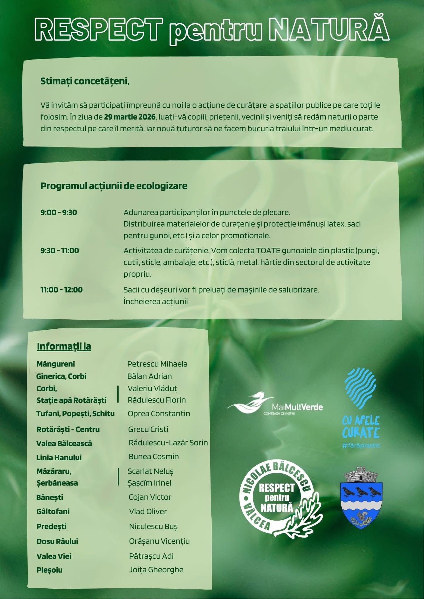 Primăria Nicolae Bălcescu anunță o amplă acțiune de ecologizare programată pentru 29 martie 2026, începând cu ora 09:00, desfășurată simultan în mai multe sate ale comunei: Mângureni, Ginerica, Corbi, zona Stației de apă Rotărăști, Tufani, Popești, Schitu, Rotărăști-Centru, Valea Bălcească, Linia Hanului, Măzăraru, Șerbăneasa, Bănești, Gâltofeni, Predești, Dosu Râului, Valea Vie și Pleșoiu.